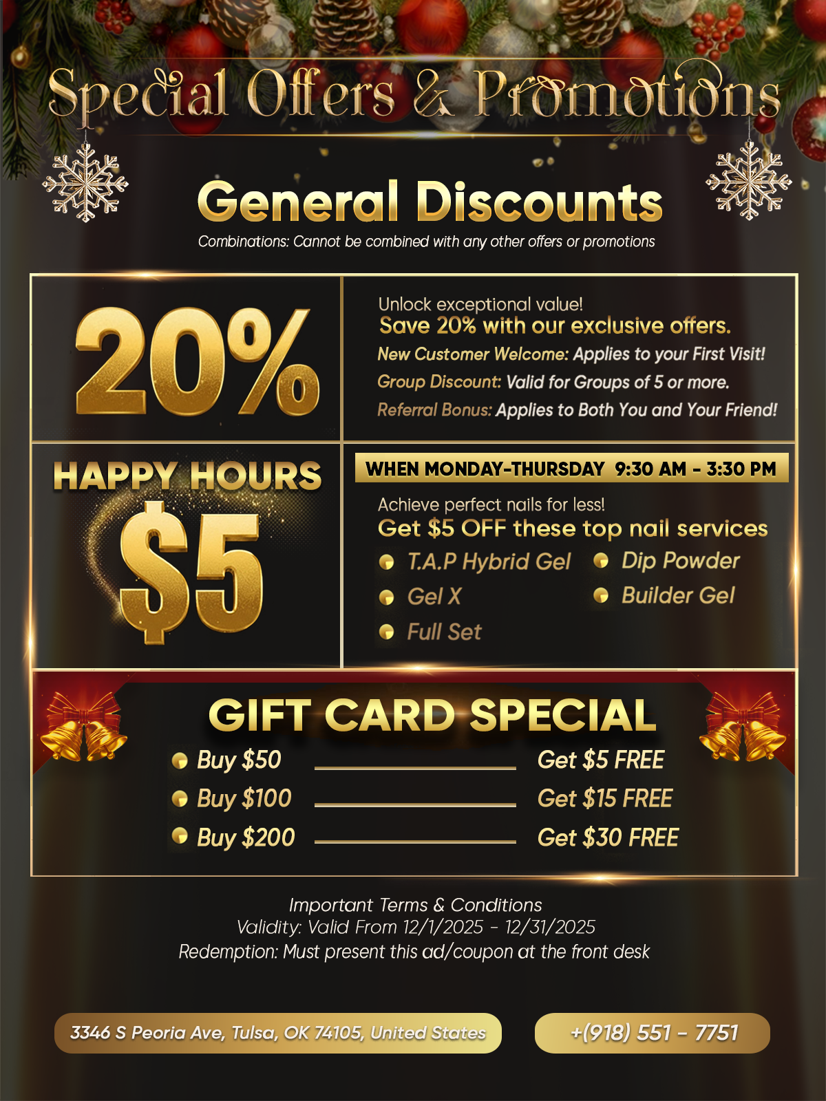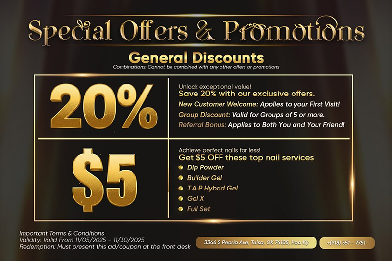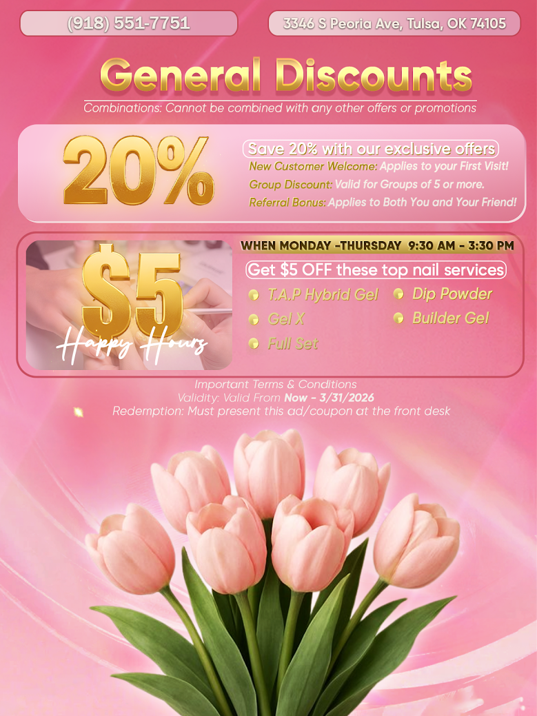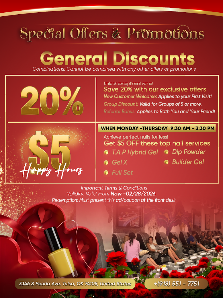 Whether you’re looking for a unique beauty and wellness journey, natural organic services and treatments, or a luxurious and modern-inspired space, our salon has you covered. We are committed to providing you with insight into a better, healthier state-being and delivering spectacular spa pedicures, manicures, and stunning nail designs. At our Nail Salon, safety and comfort come first. We strictly adhere to the highest industry standards and sanitize and disinfect all reusable nail tools according to state regulations. Come experience the ultimate pampering session with us today! Book an appointment, and let us help you relax and enjoy a rejuvenating journey. Thank you for visiting Bebe Nails and Spa, one of the best Nail Salons in Tulsa, OK 74105.
